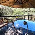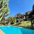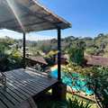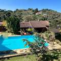 Área externa com churrasqueira e fogão a lenha, ducha externa, piscina, quintal, casa de caseiro e canil.