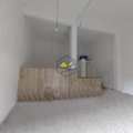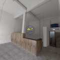 Amplo salão com balcão e um banheiro.